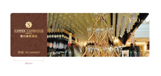 酒店代金券的設計:正面簡約勾畫出酒店的主題,以特色作為背景圖,還可附上一小段酒店的簡介,讓客戶一目了然酒店的整個結構,背面是印刷券的使用說明。將在這張酒店代金券上起到打動消費群的作用,吸引其注意,促使消費者到酒店消費。