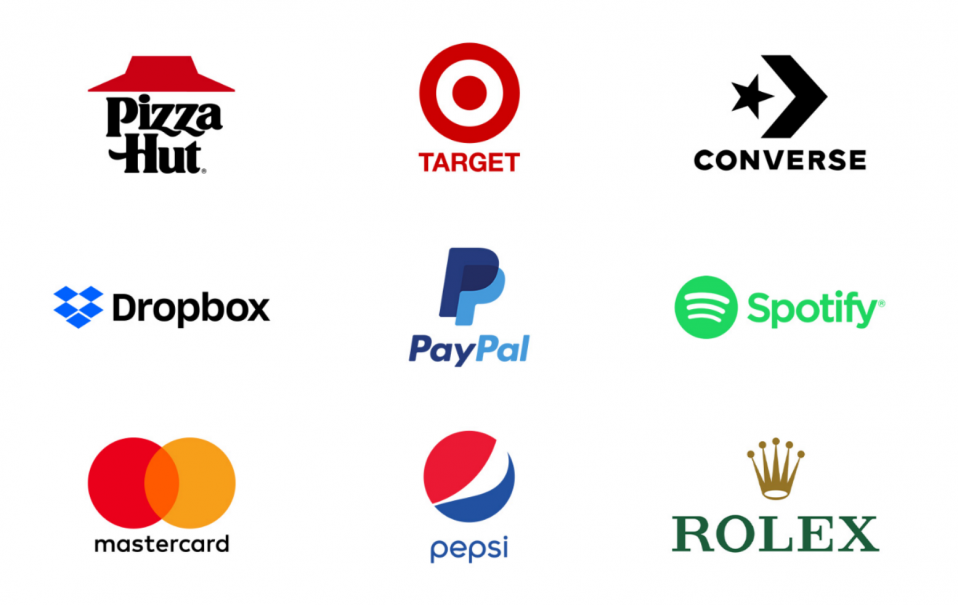 組合商標標識的示例包括:必勝客、塔吉特、匡威、Dropbox、貝寶、Spotify、萬事達卡、百事可樂、勞力士。